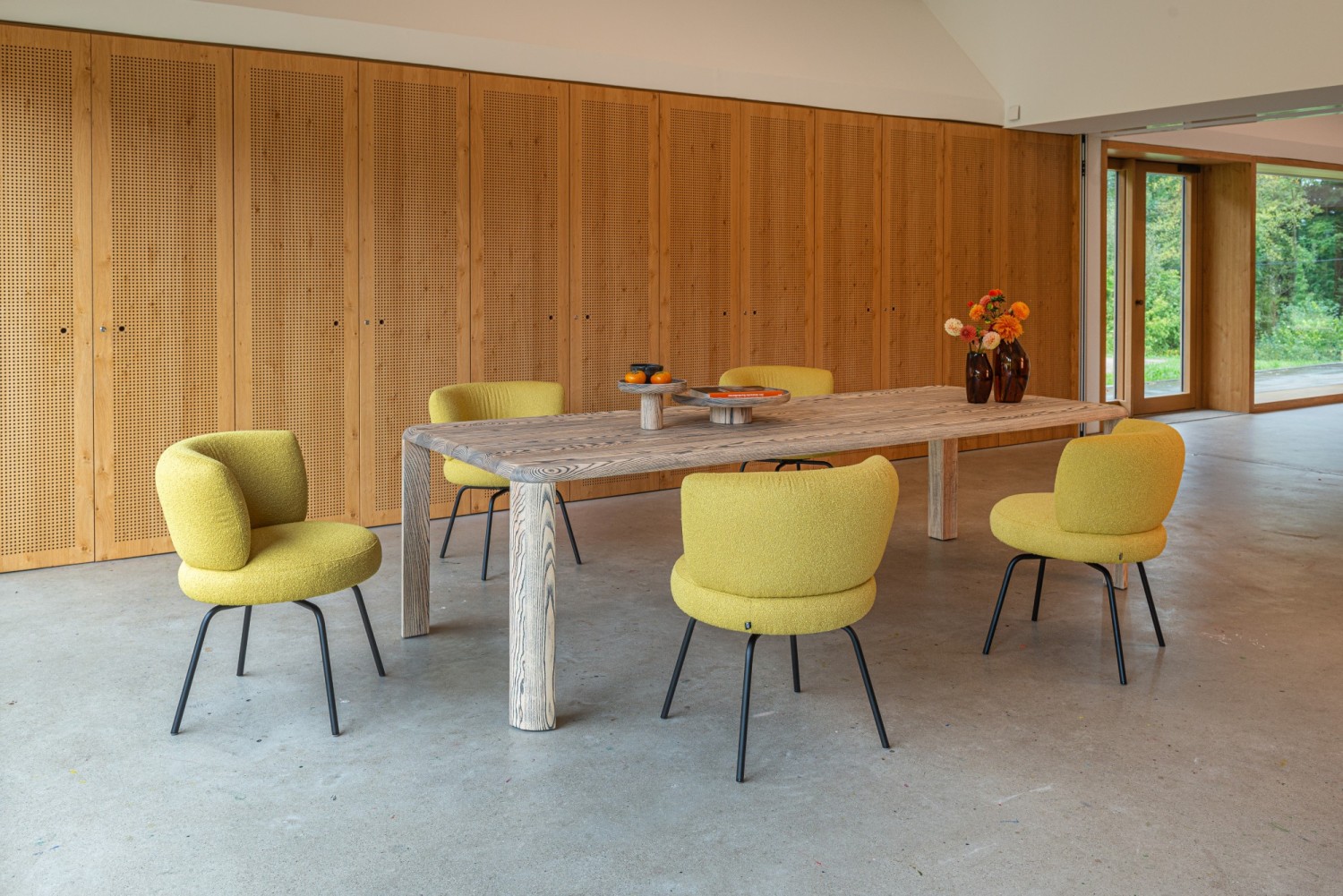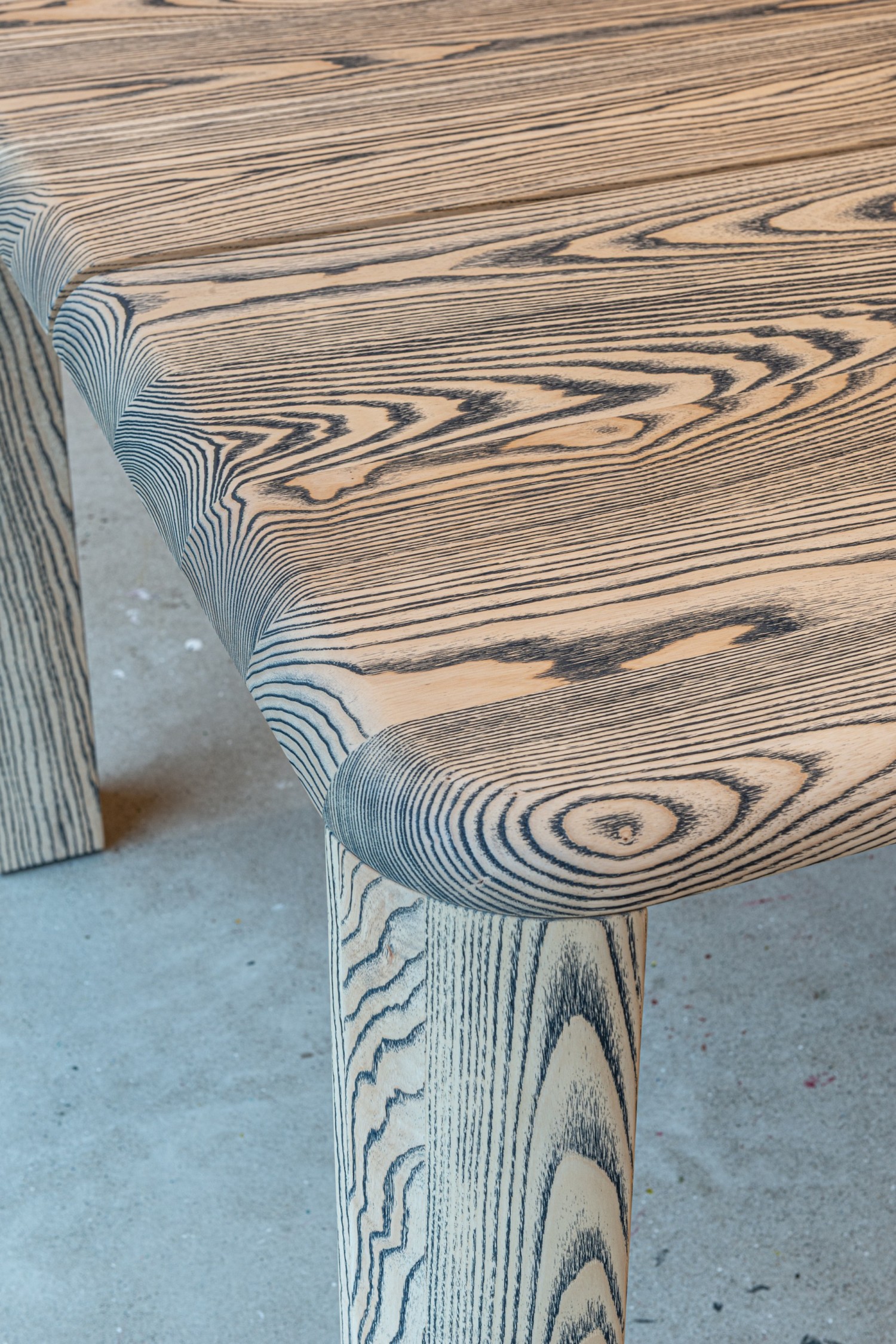 Nahezu jeder Kundenwunsch an Formen und Oberflächen kann erfüllt werden. Flächen in farbpigmentierter, geölter Brandeiche und Räuchereiche erfreuen sich aktuell großer Beliebtheit. Einige unserer Tische können aber auch teilweise mit Stoff oder Leder bezogen werden. Ein besonderes Statement-Piece.