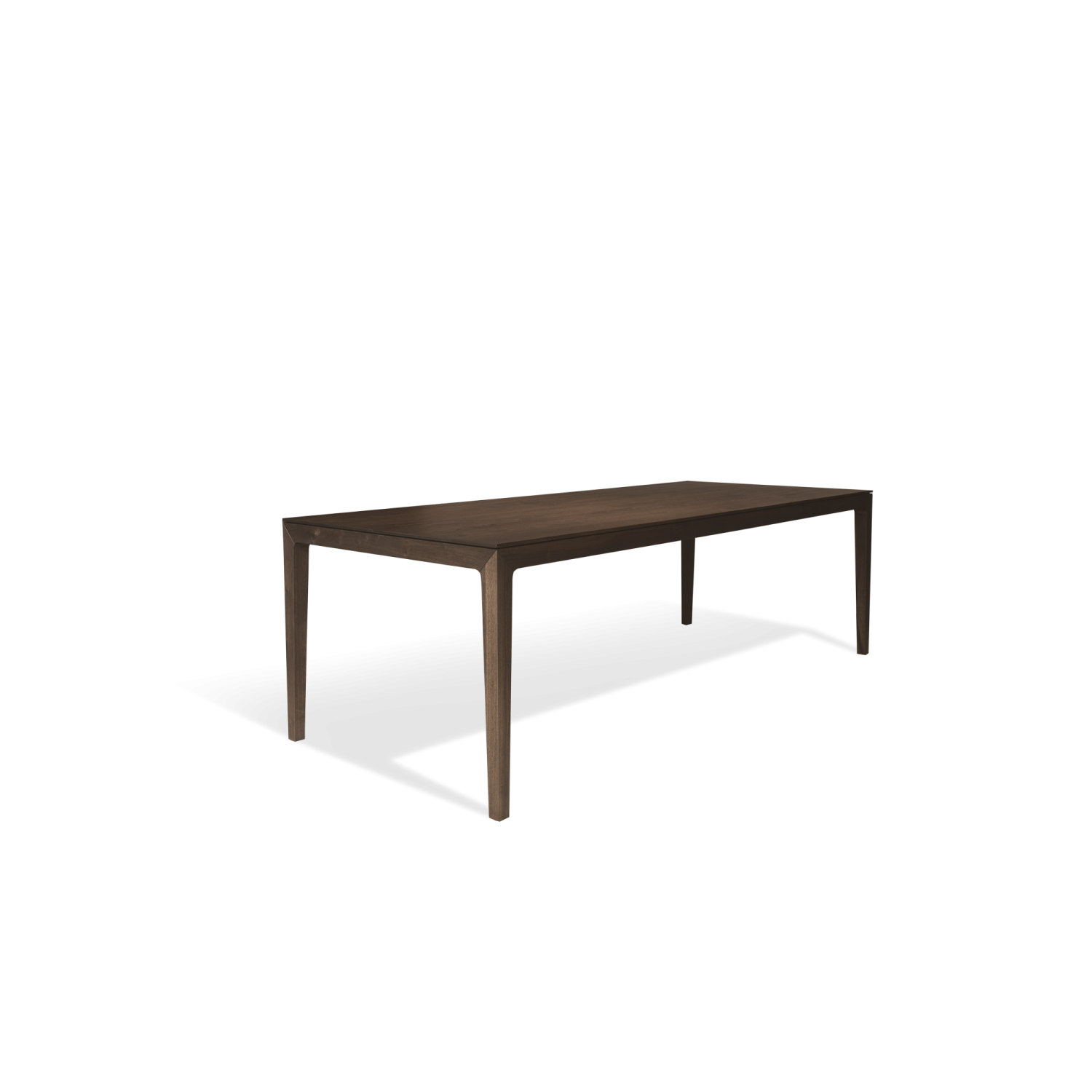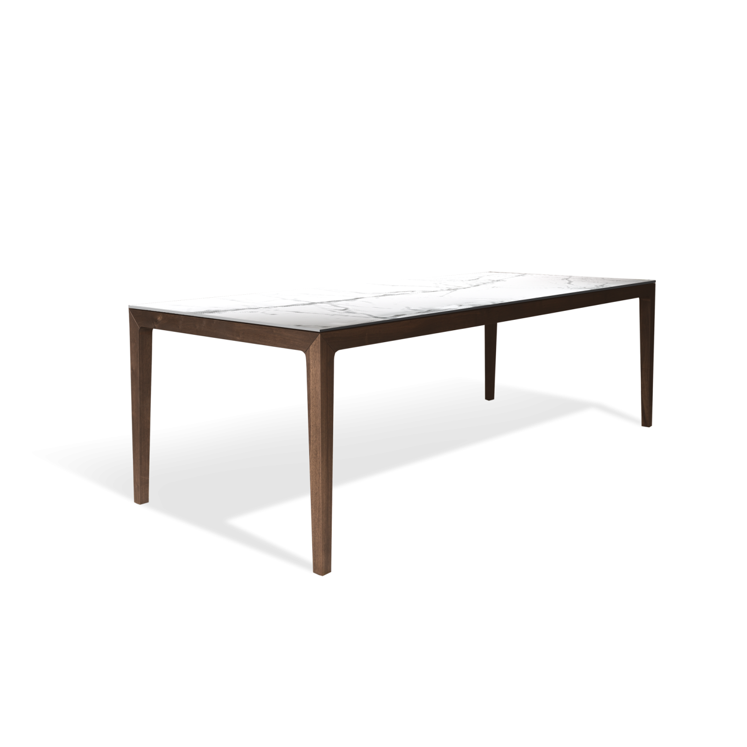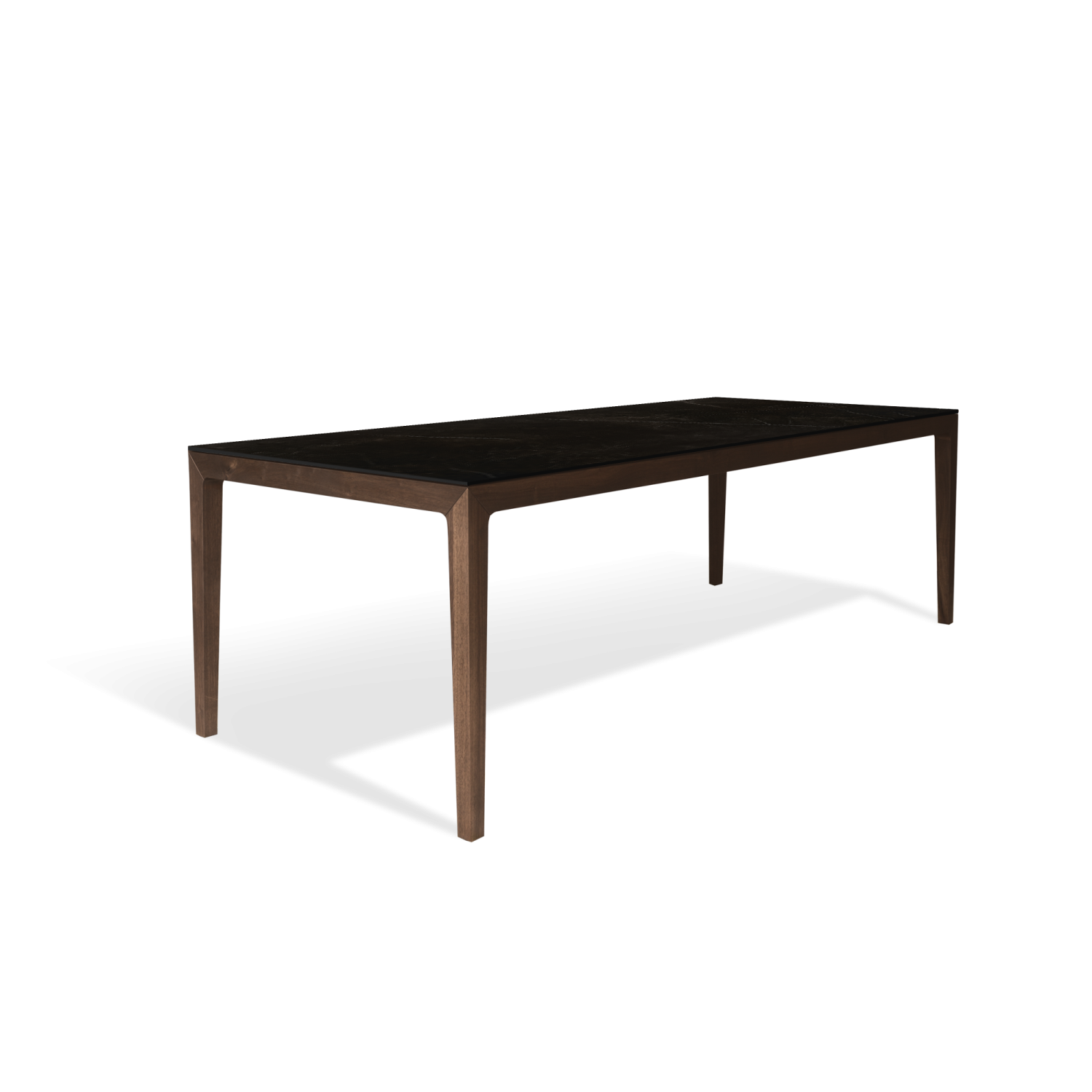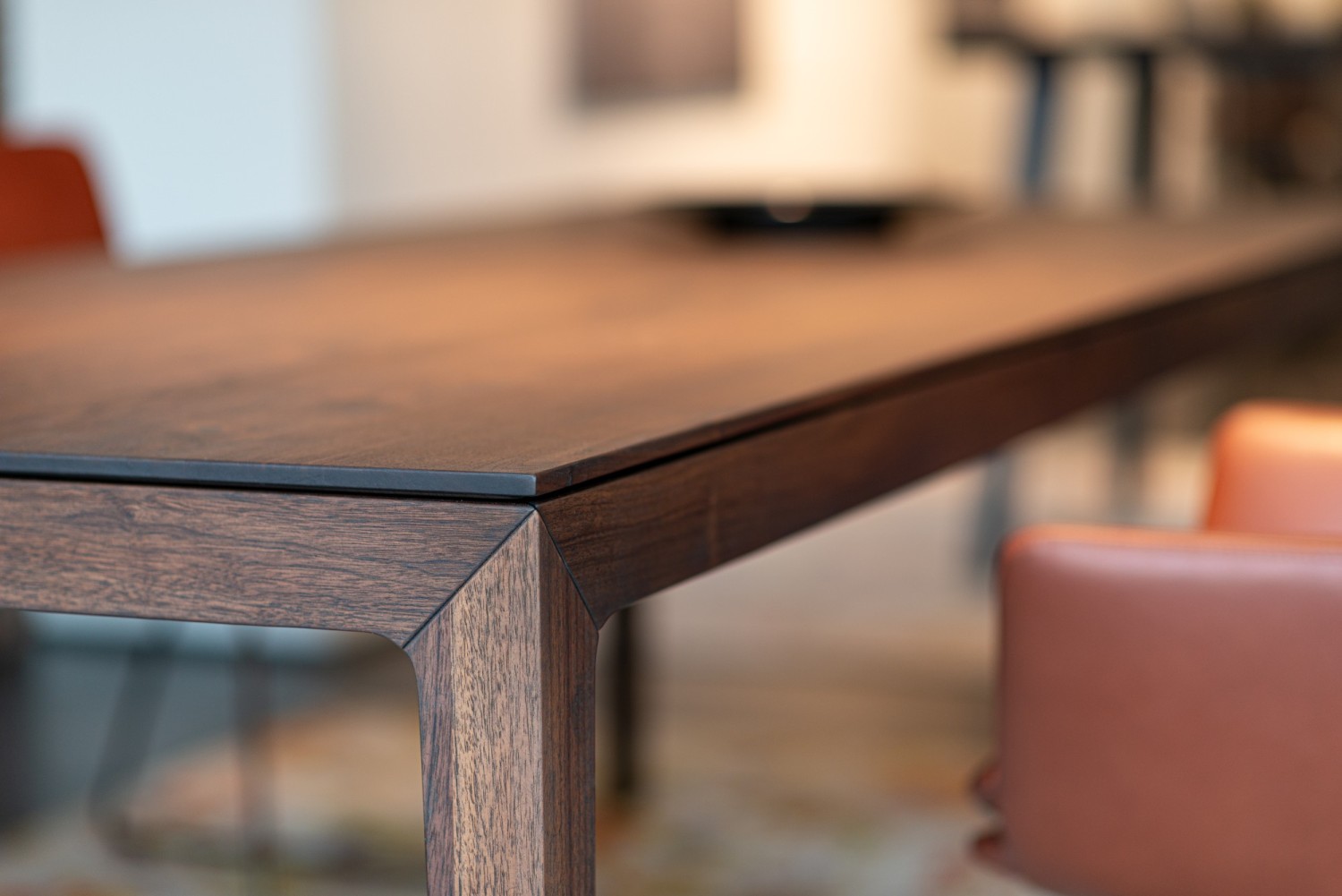 Ein Tribut an die hohe Kunst des Handwerks und die Liebe zum Detail. Dieser Esstisch ist für diejenigen gedacht, die die subtile Schönheit hochwertiger Handwerkskunst und die warme, natürliche Ästhetik von edlem Holz zu schätzen wissen. Die Tischplatte weist eine raffinierte abgefälzte Kante auf, die ihr eine fast schwebende Anmutung verleiht. Sie scheint über der massiven Holzzarge zu schweben, ein Detail, das dem Tisch eine beeindruckende Leichtigkeit und Eleganz verleiht. Die Beine verjüngen sich beidseitig fein zum Boden hin und gehen in einem filigranen, abgerundeten Gehrungsdetail in die Tischzarge über. Diese anspruchsvolle Gestaltung verleiht dem Aereo eine dynamische und dennoch harmonische Ausstrahlung.