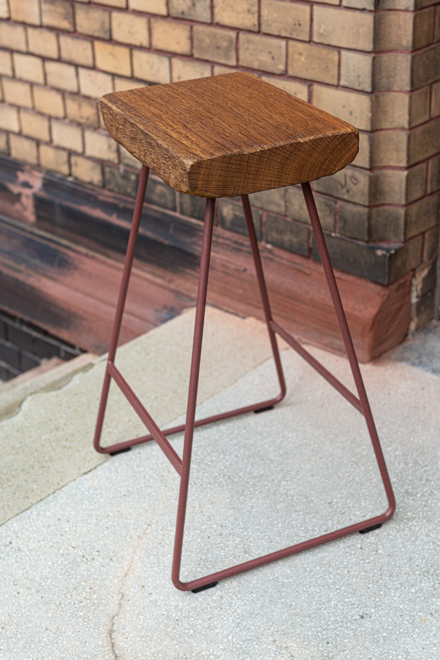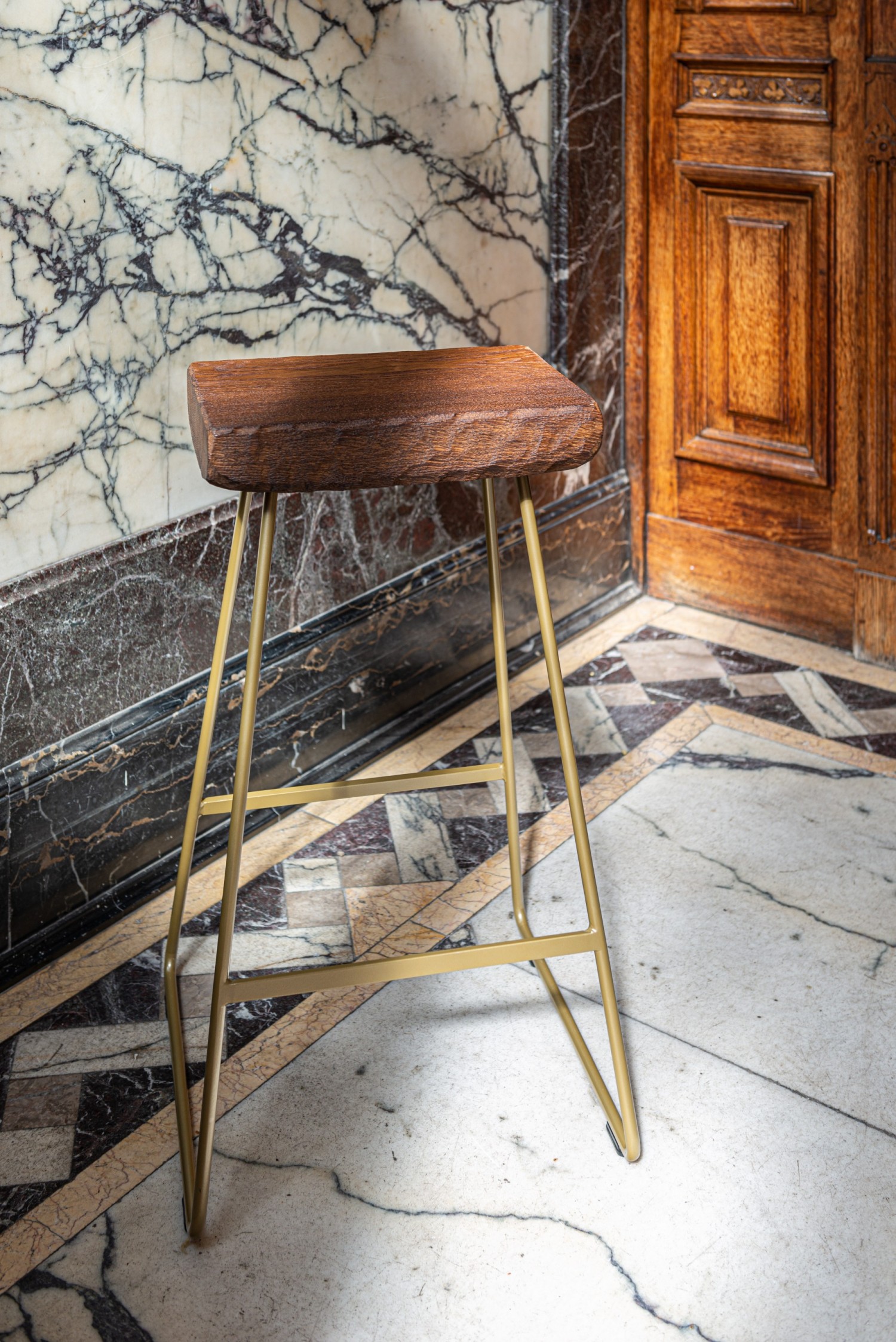 Bengt ist ein Thekenhocker. Dieses handgefertigte Möbel von Designer Nick Pyka ist ein Materialmix aus Massivholz und Stahl. Die Urwüchsigkeit der aus einem Stück gefertigten urbanen RohDesign Sitzplatte, auf schlankem Kufengestell mit Trittstange, zeigt sich in der traditionell ausgebürsteten, gewachsten und nach Wunsch gebrannten, geölten oder farblich pigmentierten Oberfläche. Die Kante wird nach traditioneller Handwerkskunst von Hand mit der Axt beschlagen. Jeder Thekenhocker ist ein unverwechselbares Unikat.