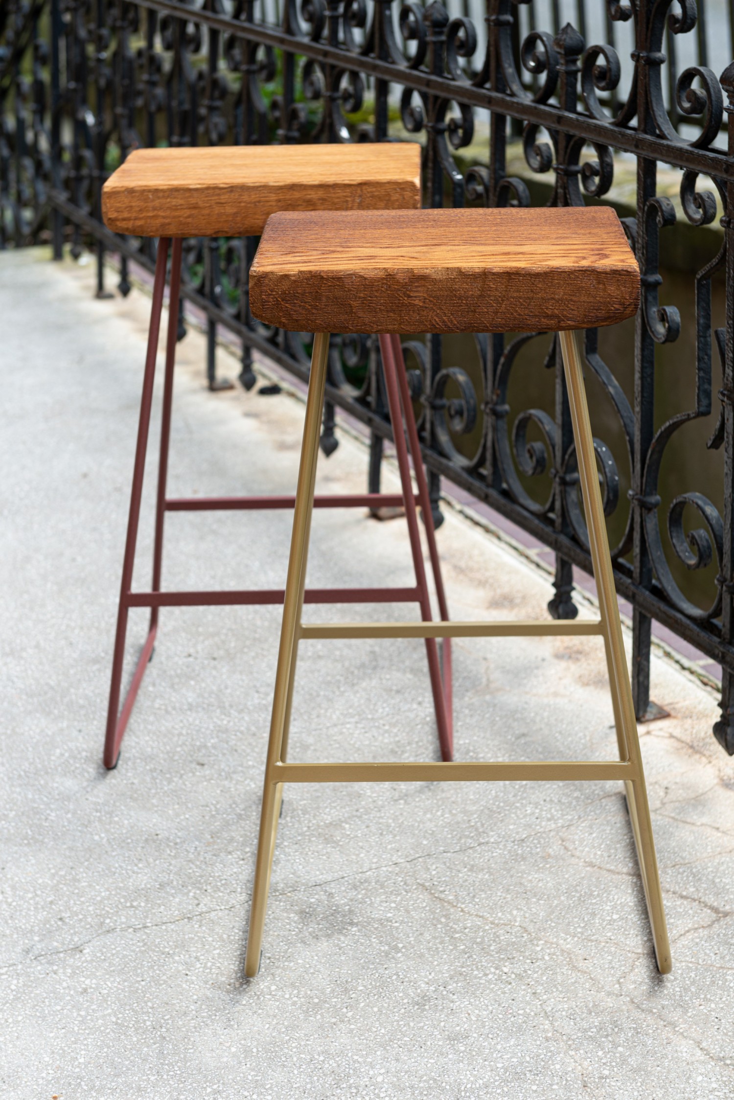 Hocker mit Drahtkufengestell, pulverbeschichtet. Sitzfläche 35 x 25 cm in Massiv-holz RohDesign mit handwerklich stark herausgearbeiteten Holzmerkmalen und handbeschlagenen Kanten. Untergestell wahlweise mit Kunststoff- oder Filzgleitern.