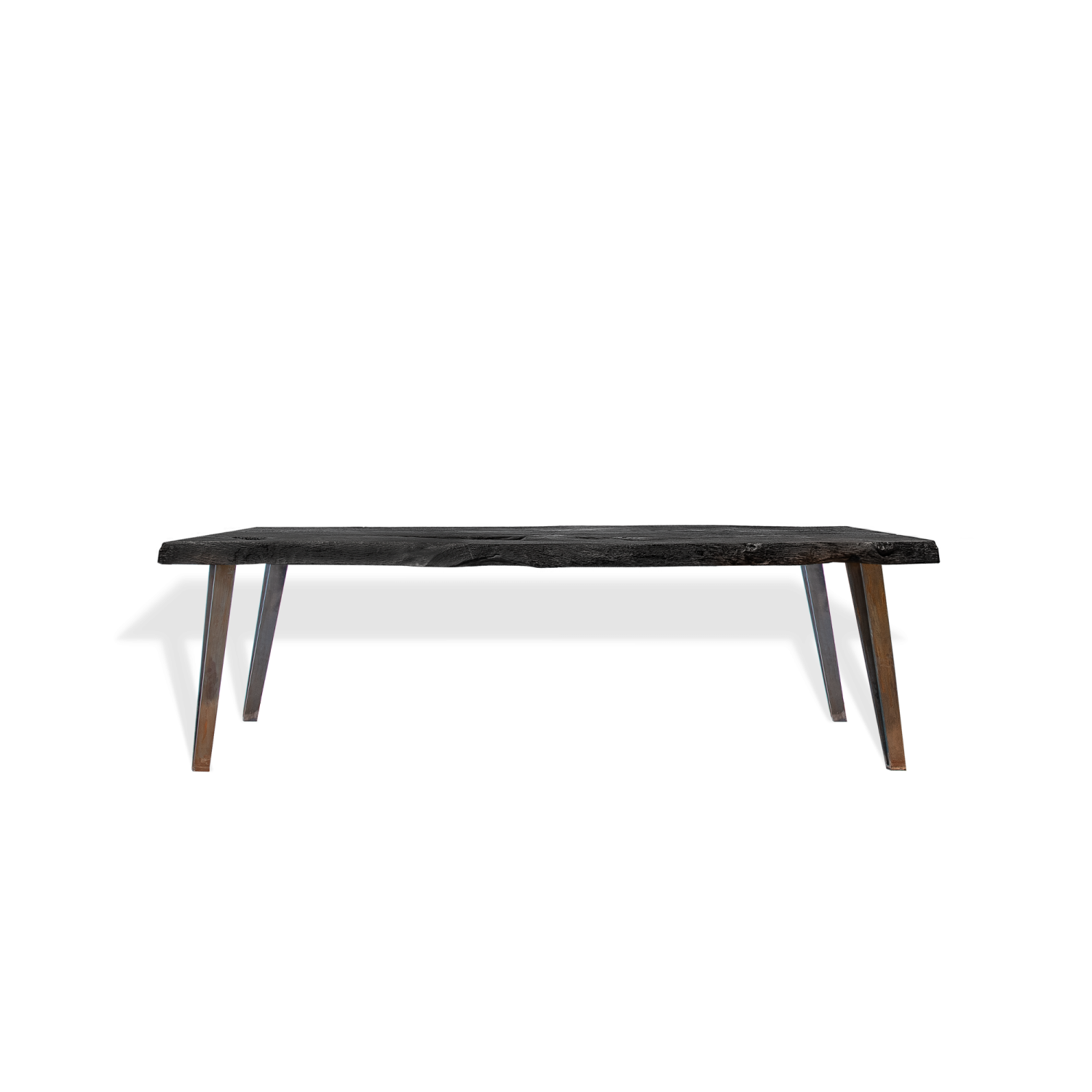 Tisch mit ausgestellten offenen Tischbeinen aus Flachstahl, pulverbeschichtet oder Roh-stahl geölt. Die Tischplatte in Massivholz zeigt sichtbare Naturmerkmale. Tischbeine mit Filzgleitern.