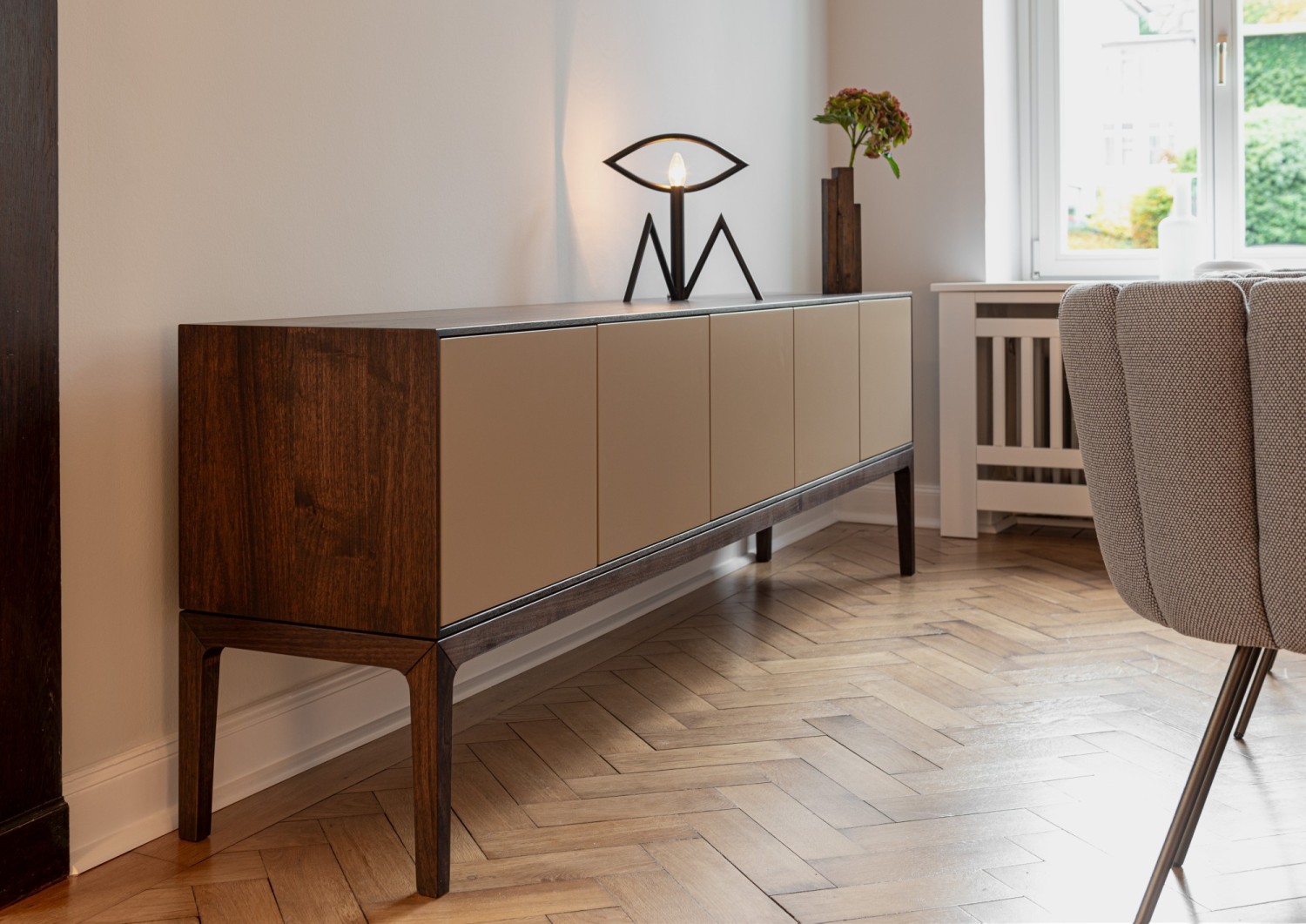 The Add-on sideboard is a freely configurable piece of furniture with a minimalist design. The carcase is bevelled. The handleless doors can be opened with a push-to-open function and are flush-fitted. The fine shadow edge gives the furniture a light and elegant appearance. It can be positioned on the wall or free-standing in the room. It can be placed hanging or standing, as a solitaire or in pairs, open or closed, natural, plain or colourful. The special highlight: the sideboard creates synergies and builds a bridge to the ASCO dining table through the material, colour and the optionally reduced table leg frame for the sideboard. A personalised and cosy ensemble with functional properties.