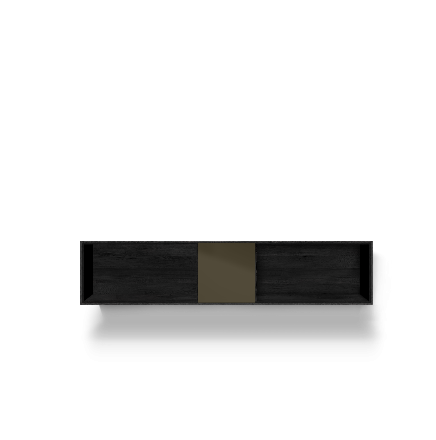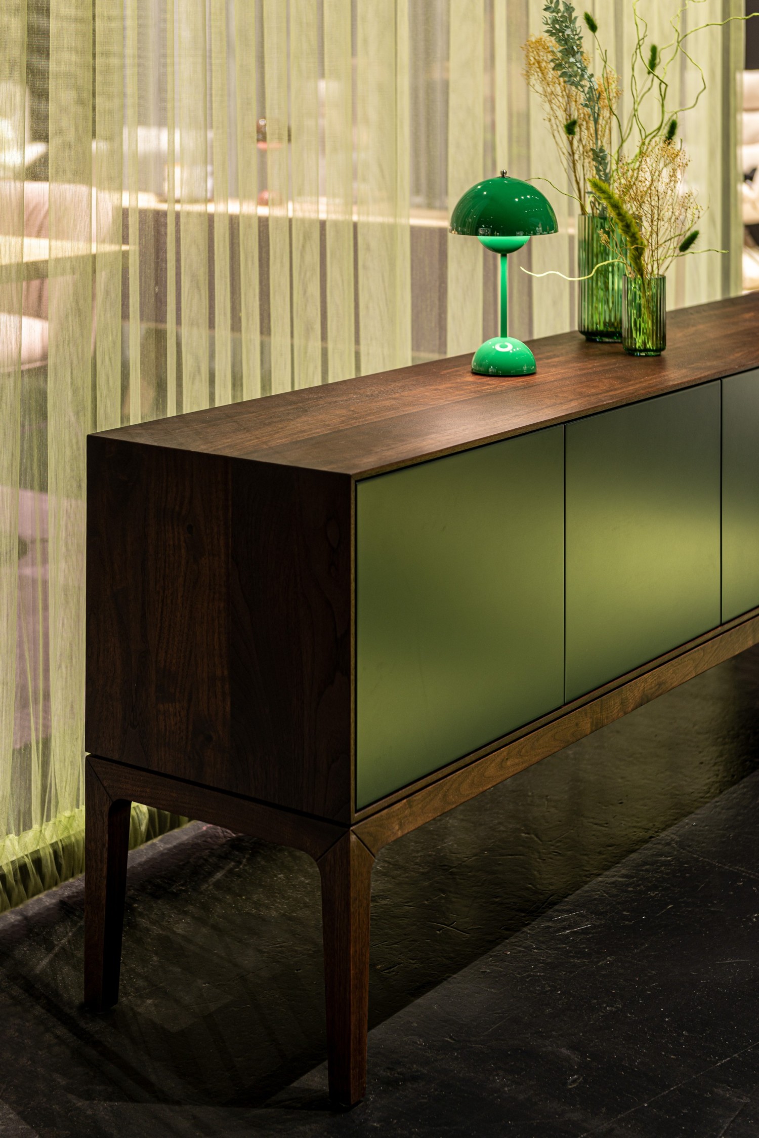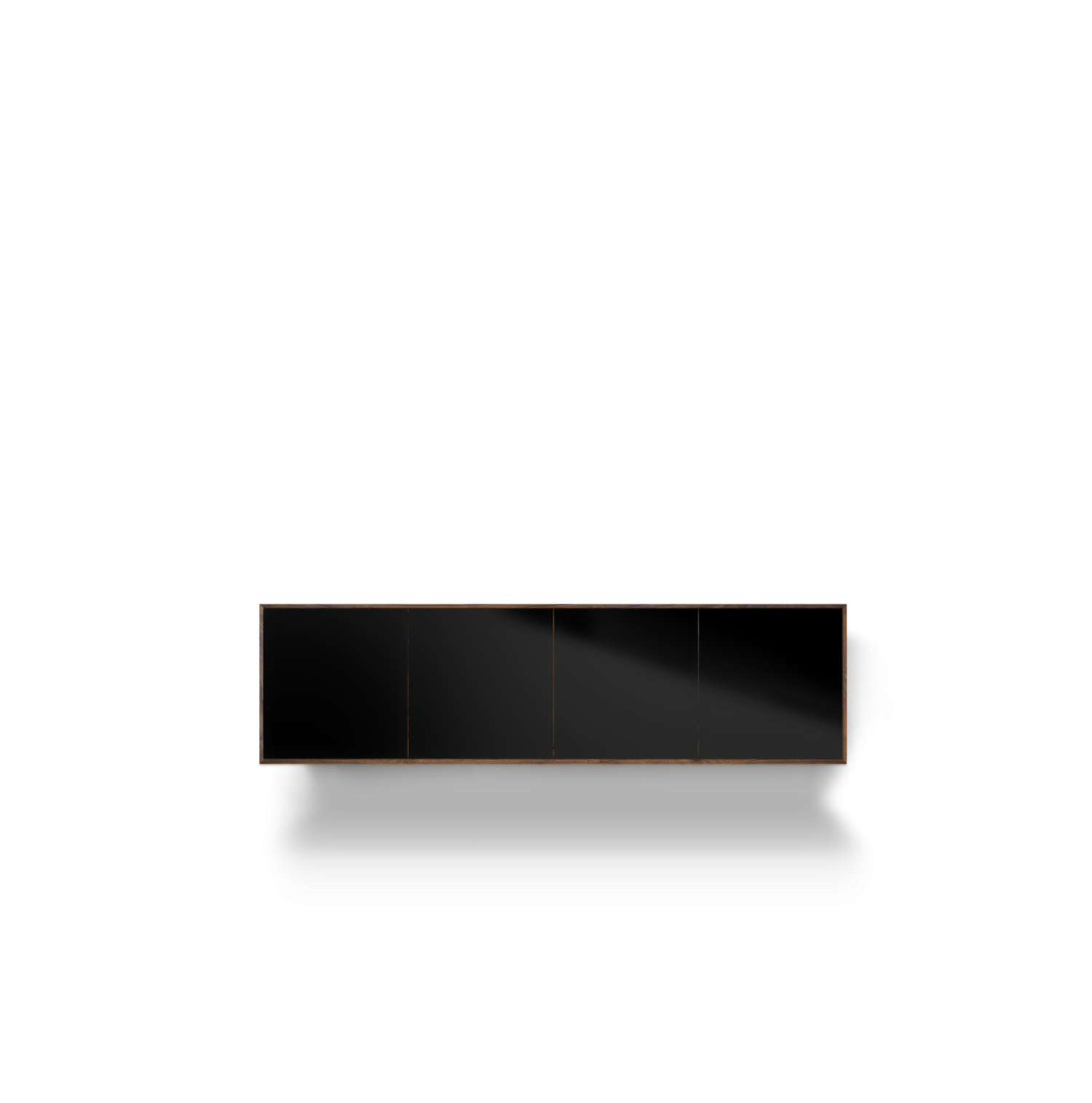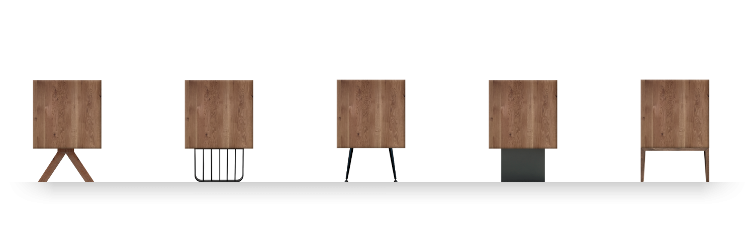Solid wood body. Veneered back panel. Glued mitred corners. Handleless fronts made of MDF material and painted on all sides in RAL colour. Basic package: 3, 4 or 5-door, 5 woods/carcase colours from the ASCO collection. Choice of 5 RAL front colours, freely suspended carcass. Options: all RAL colours, front configurable with 1-5 doors. Powder-coated frame options can be selected from the ASCO dining table collection. Visible rear panel and shelves possible.