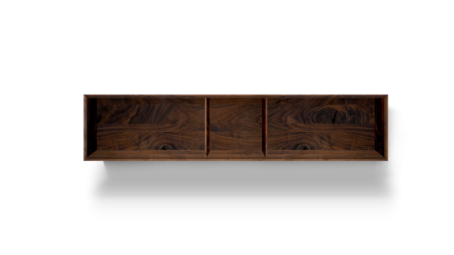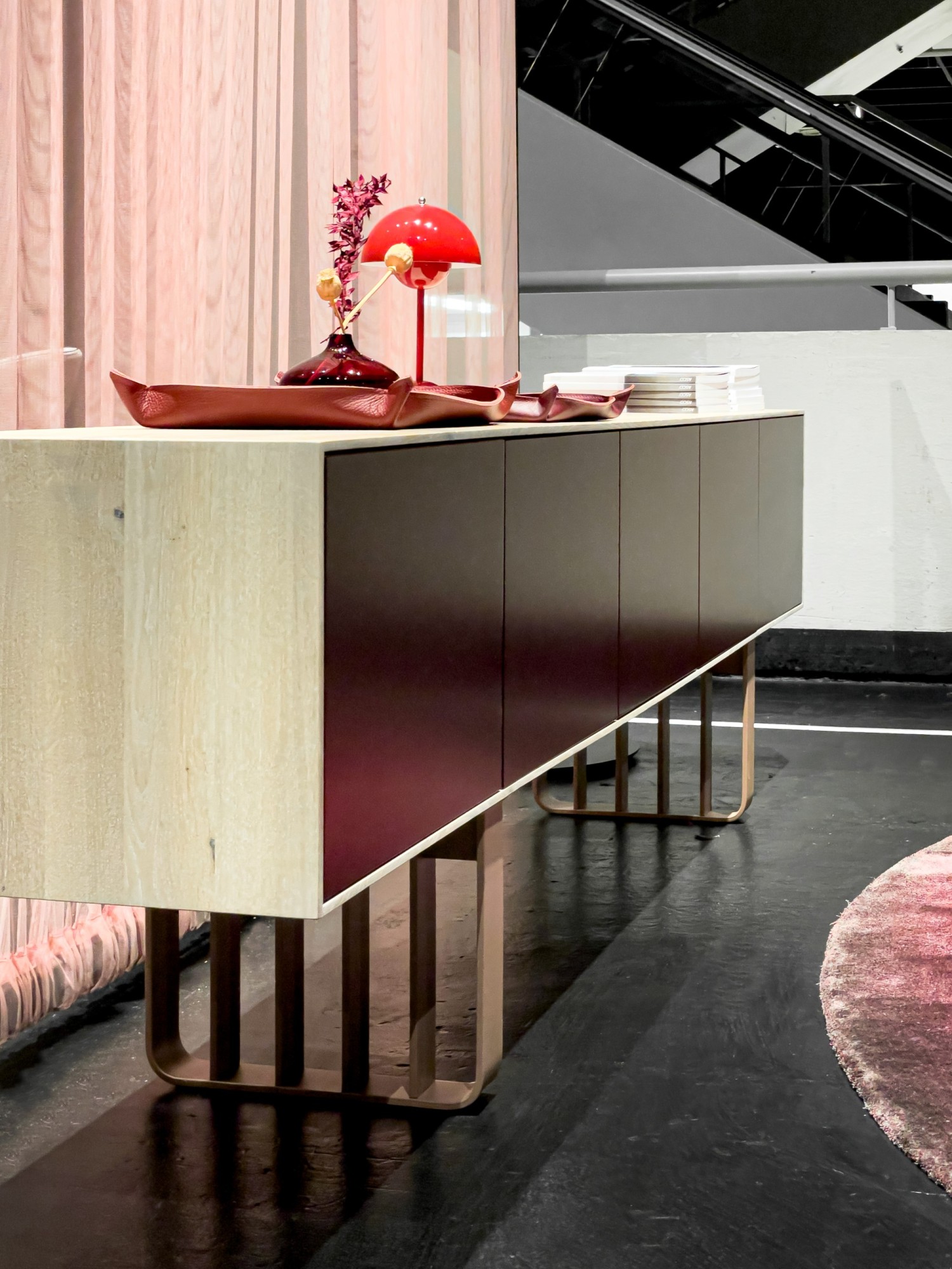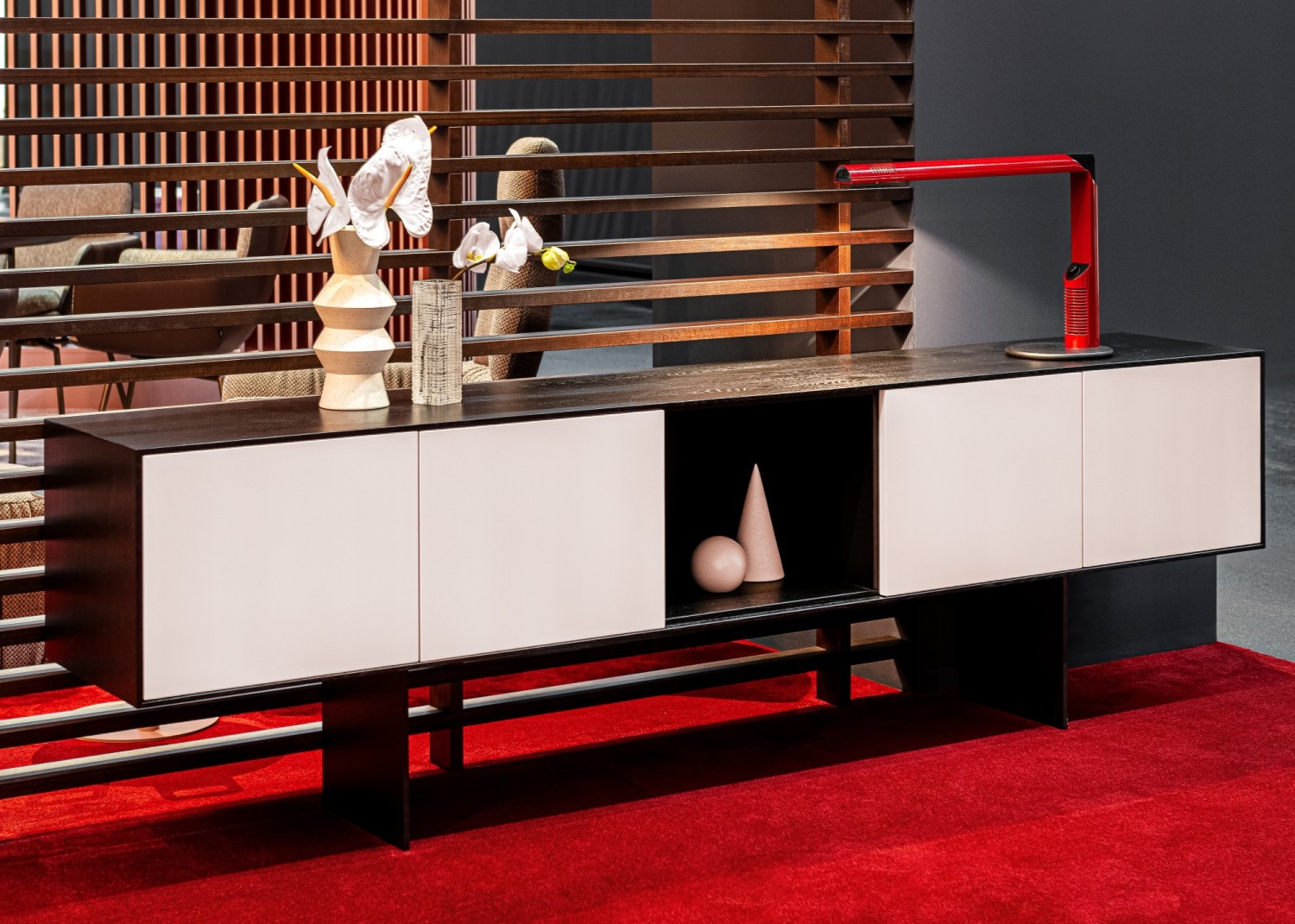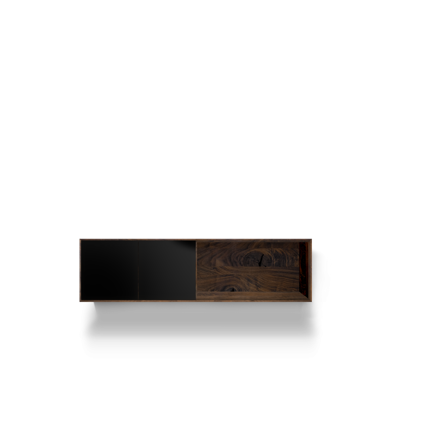 Solid wood body. Veneered back panel. Glued mitred corners. Handleless fronts made of MDF material and painted on all sides in RAL colour. Basic package: 3, 4 or 5-door, 5 woods/carcase colours from the ASCO collection. Choice of 5 RAL front colours, freely suspended carcass. Options: all RAL colours, front configurable with 1-5 doors. Powder-coated frame options can be selected from the ASCO dining table collection. Visible rear panel and shelves possible.