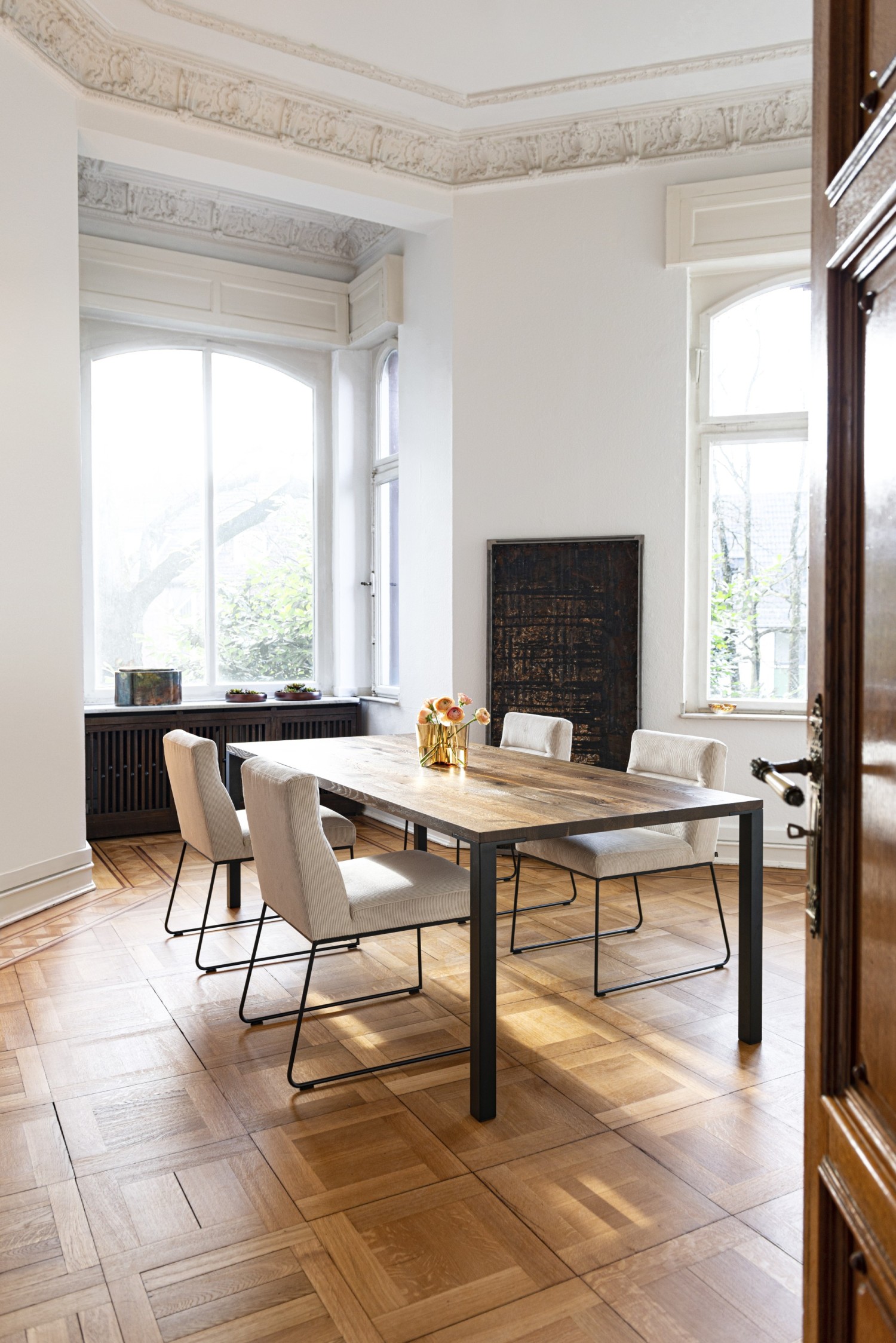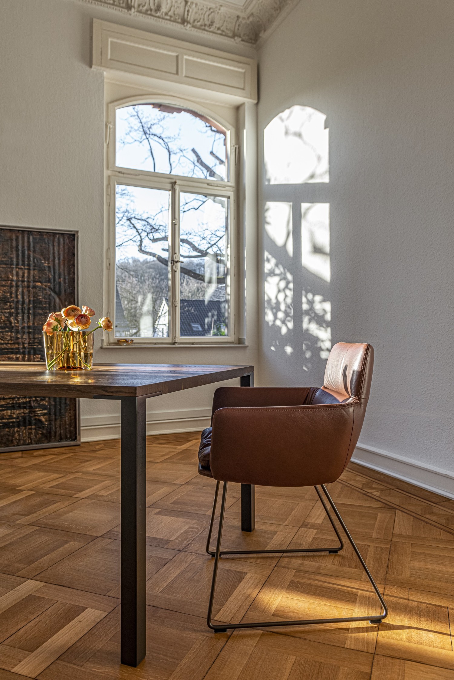 The cubic architecture inspires with its formal restraint in the design language. The detail is therefore all the more important. Fine lines reduced to the essential. The Asco design team has paid special attention to the connections between the 4-leg frame and the solid wood tabletop. The base frame is recessed into the table top and seamlessly joined. This fusion of the four corners is the special feature of the dining table, which is otherwise deliberately reduced in design. With the sensitive selection of materials, contrast can be played with at this point. The Ferro line can be extended with one or two extension leaves for spontaneous guests. A table with grace and character.