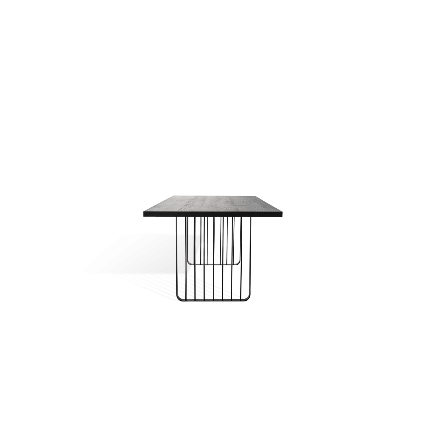 Filigree and yet solid-transparent and opaque. Opposites attract in this design. Depending on the point of view, the upright slats of the steel sides offer attractive views in and out. This gives this versatile dining table its inviting character. The solid wood tabletop provides an exciting contrast. The clear lines and the diverse choice of materials make the Lamello table a unique and expressive element for the most diverse living concepts.